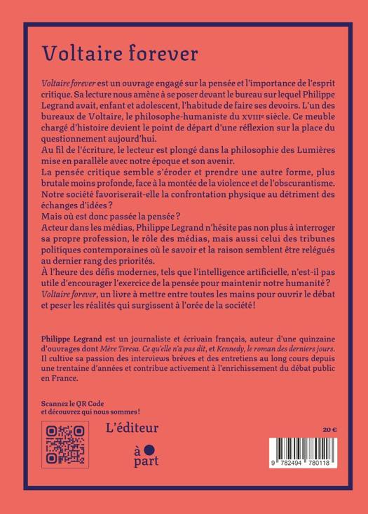 Du bureau de Voltaire, celui-là même sur lequel PhilippeLegrand, enfant, avait l’habitude de faire ses devoirs, émane une histoireriche. Ce meuble, chargé d'histoire, sert de point de départ pour plonger leslecteurs dans la philosophie des Lumières. Il ouvre la voie à une réflexion surl'importance de l'esprit critique, valeur chère à Voltaire, l’un des grandshumanistes duXVIIIe siècle. Philippe Legrand questionne notre époque et sonavenir, alors que la pensée critique semble s'éroder face à la montée de laviolence et de l'obscurantisme. Notre société favorise la confrontation physiqueau détriment des échanges d'idées. Journalistepassionné, Philippe Legrand n'hésite pas à tourner son regard critique vers sapropre profession, interrogeant le rôle des médias qui, souvent, ne cessent devéhiculer des images choquantes et sensationnelles. Les débats politiquescontemporains ne sont pas épargnés non plus par cet abandon du savoir et de laraison. À l'heure des défis modernes, tels que l'intelligence artificielle, ilnous rappelle l'importance vitale de préserver l'exercice de la pensée, pourmaintenir notre humanité. Voltaire forever interroge la place del'esprit critique dans notre société moderne, et le futur qui lui est réservé.C'est une lecture indispensable pour celles et ceux qui souhaitent comprendreles enjeux de notre époque, et raviver la flamme d’une pensée éclairée.