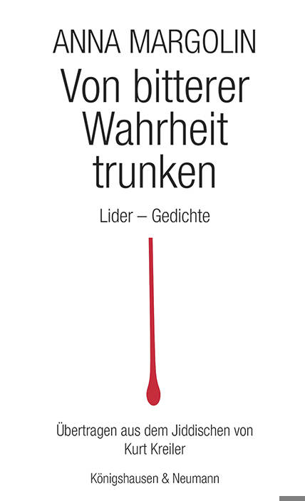 Anna Margolin geboren in Brest-Litwosk 1887, gestorben in New York 1952, gehört mit Itzik Manger und Abraham Sutzkever zum Dreigestirn der jiddischen Poesie. Anna Margolin liebt die Stärke, die sich unterwirft, und hasst die Schwäche, die sich erhebt. Als Königin des Worts, unerbittlich in ihrer Sicht auf sich selbst, thront sie auf einem zerbrochenen Stuhl und verteilt Becher mit Gift und Glück an die von ihr erschaffenen Gestalten. Sie weiß, dass dabei Gedichte von seltener Schönheit und Magie entstehen, traumhaft real, weitsichtig und bilderreich, das Universum der Liebe und des Schmerzes umfassend. Aber sie kann sich die eigene Traurigkeit nicht verzeihen. Anna Margolins Bilder sind unverbraucht, ihre Reime haben die Wucht von Herzschlägen.Der Band versammelt in einer zweisprachigen Ausgabe zweiundvierzig Gedichte der Dichterin, die in Deutschland zu den Unbekannten zählt.