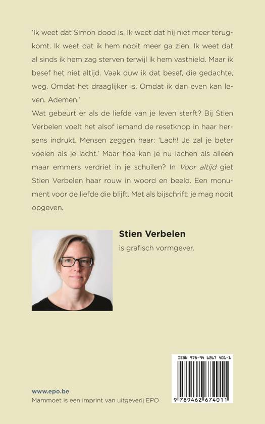 Wat gebeurt er als de liefde van je leven sterft? Bij Stien Verbelen voelt het alsof iemand de resetknop in haar hersens indrukt. Mensen zeggen haar: ‘Lach! Je zal je beter voelen als je lacht.’ Maar hoe kan je nu lachen als alleen maar emmers verdriet in je schuilen? In Voor altijd giet Stien Verbelen haar rouw in woord en beeld. Een monument voor de liefde die blijft. Met als bijschrift: je mag nooit opgeven.