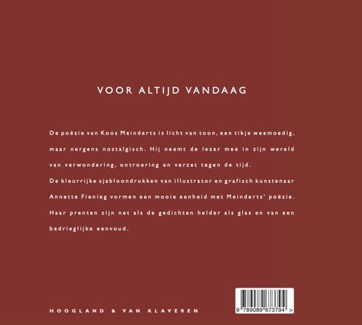 De poëzie van Koos Meinderts is licht van toon, een tikje weemoedig, maar nergens nostalgisch. Hij neemt de lezer mee in zijn wereld van verwondering, ontroering en verzet tegen de tijd. De kleurrijke sjabloondrukken van illustrator en grafisch kunstenaar Annette Fienieg vormen een mooie eenheid met Meinderts’ poëzie. Haar prenten zijn net als de gedichten helder als glas en van een bedrieglijke eenvoud.