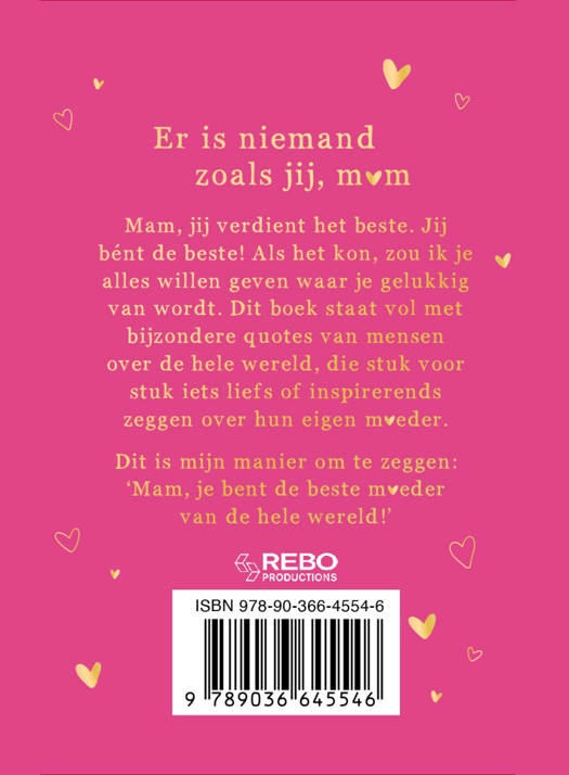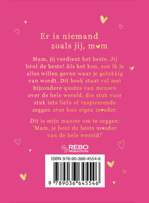 Mam, jij verdient het beste. Jij bént de beste! als het kon, zou ik je alles willen geven waar je gelukkig van wordt. Dit boek staat vol met bijzondere quotes van mensen over de hele wereld, die stuk voor stuk iets liefs of inspirerends zeggen over hun eigen moeder.