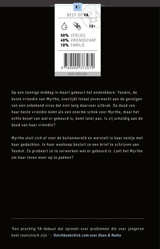 Voor Yasmin is onderdeel van de Best of YA | XS-reeks. Meer lezen uit deze reeks? Lees ook: • Mirjam Mous – Girl 6 • Danielle Bakhuis – De laatste uren van Josephine Donkers • Buddy Tegenbosch – Mijn nacht met Vedder • Saskia Mouissie – De belofte • Mijke Pelgrim – Over straatfiguren en wegpiraten • Henk Hardeman – Wat gebeurde er met David? • Mirjam Mous – Welkom in Smartpark • Esther Walraven – Wind