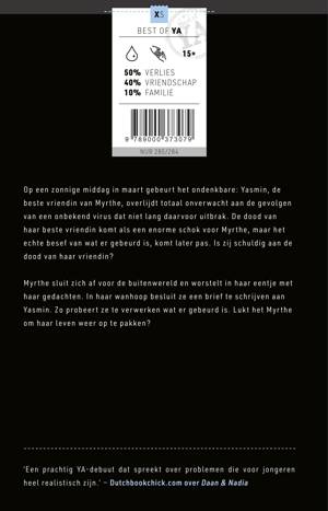 Op een zonnige middag in maart 2020 gebeurt het ondenkbare: Yasmin, de beste vriendin van Myrthe, overlijdt totaal onverwacht aan de gevolgen van een onbekend virus dat enkele maanden eerder uitbrak. De dood van haar beste vriendin komt als een enorme schok voor Myrthe, maar het echte besef van wat er gebeurd is, komt later pas. Is zij schuldig aan de dood van haar vriendin? Waarom mag zij verder leven en Yasmin niet? En wat heeft haar leven nog voor zin, nu Yasmin er niet meer is? Myrthe worstelt in haar eentje met deze vragen en sluit zich af voor de buitenwereld. De enige bij wie ze nu wil zijn, is er niet meer. In haar wanhoop besluit ze een brief te schrijven aan Yasmin. Al schrijvend doet ze een poging te verwerken wat er gebeurd is. En langzaamaan pakt ze haar leven weer op. Voor Yasmin.
