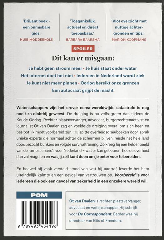 Je hebt geen stroom meer - Je huis staat onder water - Het internet doet het niet - Iedereen in Nederland wordt ziek - Je kunt niet meer pinnen - Oorlog bereikt onze grenzen - Een autocraat grijpt de macht'Voorbereid vult precies het gat waar we in deze onzekere tijden in vallen: tussen paniek en passiviteit. Geen doemdenken, geen bunkerfantasieën, maar realistische scenario’s en concrete oplossingen. Alleen Ot van Daalen kan met én droge humor én juridische precisie uitleggen hoe kwetsbaar Nederland is, en wat we daaraan kunnen doen.'