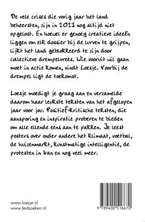 Loesje moedigt je graag aan en verzamelde daarom haar leukste teksten van het afgelopen jaar voor jou. Positief-kritische teksten, die aansporing en inspiratie proberen te bieden om al die ellende eens aan te pakken. Je leest posters over onder andere het klimaat, voetbal, de huizenmarkt, kunstmatige intelligentie, de protesten in Iran en nog veel meer.