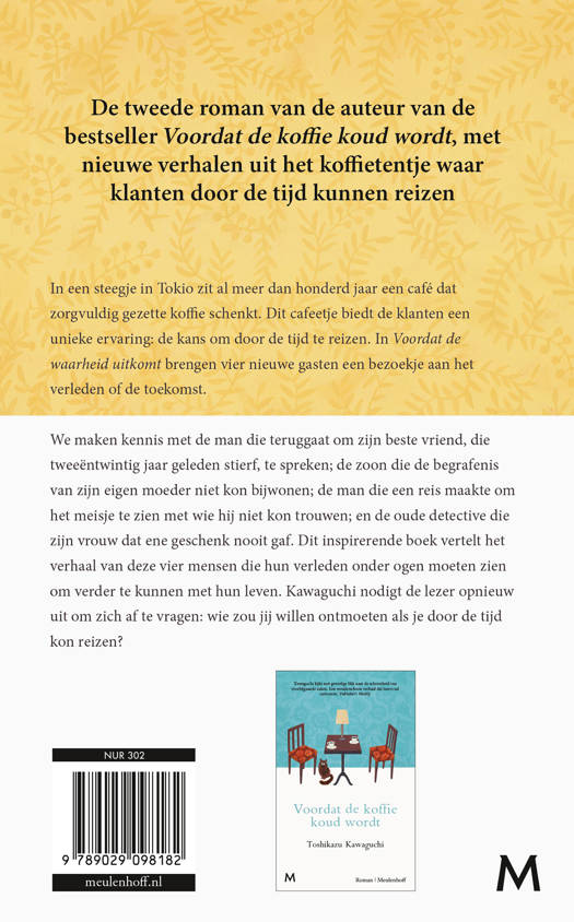 We maken kennis met de man die teruggaat om zijn beste vriend, die tweeëntwintig jaar geleden stierf, te spreken; de zoon die de begrafenis van zijn eigen moeder niet kon bijwonen; de man die een reis maakte om het meisje te zien met wie hij niet kon trouwen; en de oude detective die zijn vrouw dat ene geschenk nooit gaf. Dit inspirerende boek vertelt het verhaal van deze vier mensen die hun verleden onder ogen moeten zien om verder te kunnen met hun leven. Kawaguchi nodigt de lezer opnieuw uit om zich af te vragen: wat zou jij veranderen als je door de tijd zou kunnen reizen?