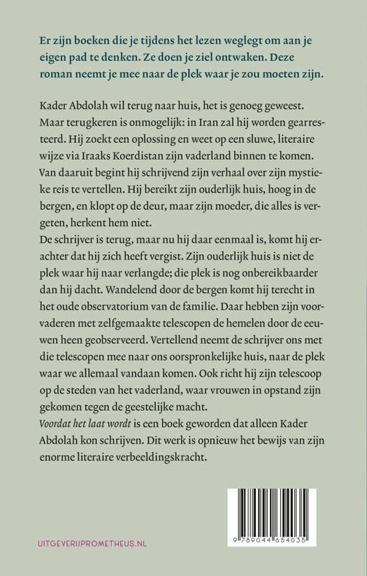 Kader Abdolah wil terug naar huis, het is genoeg geweest. Maar terugkeren is onmogelijk: in Iran zal hij worden gearresteerd. Met een vals paspoort en onder een andere naam weet hij op sluwe wijze via Iraaks Koerdistan zijn vaderland binnen te komen en hij bereikt zijn ouderlijk huis, hoog in de bergen; maar zijn moeder, die alles is vergeten, herkent hem niet. Kader Abdolah is terug, maar nu hij daar eenmaal is, komt hij erachter dat hij zich heeft vergist. Zijn ouderlijk huis was niet de plaats waarnaar hij verlangde: die plaats was nog onbereikbaarder dan hij dacht. Wandelend door de bergen en langs ravijnen komt hij terecht in het oude observatorium van de familie. Daar hebben zijn voorvaderen met zelfgemaakte telescopen de hemelen door de eeuwen heen geobserveerd. De schrijver neemt ons met die telescopen mee naar ons oorspronkelijke thuis, naar de plek waar we allemaal vandaan komen. Ook richt hij zijn kijker op de steden van het vaderland, waar vrouwen in opstand zijn gekomen tegen de geestelijke macht. Met Voordat het laat wordt snijdt Kader Abdolah een belangrijk thema van deze tijd aan. Het is een boek dat alleen hij kon schrijven. Dit werk is opnieuw het bewijs van zijn enorme literaire verbeeldingskracht.