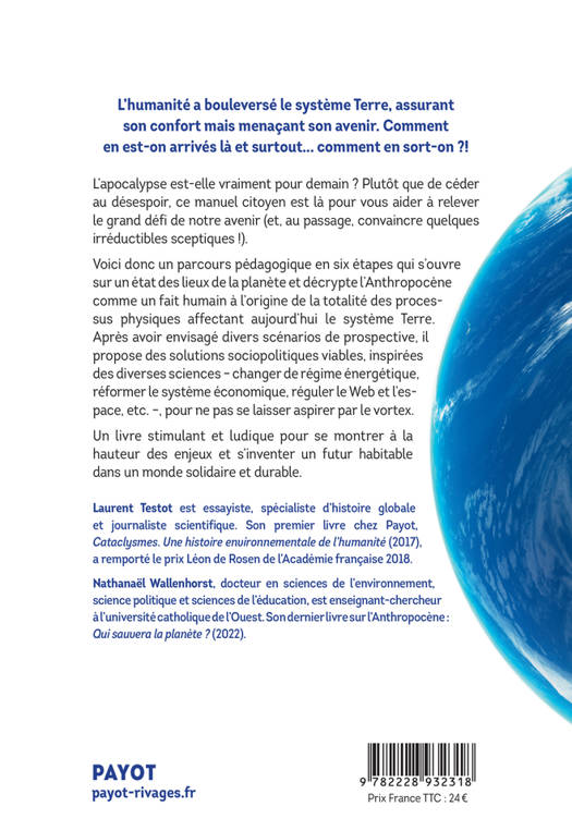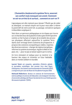 L'apocalypse est-elle vraiment pour demain ? Plutôt que de céder au désespoir, ce manuel citoyen est là pour vous aider à relever le grand défi de notre avenir (et, au passage, convaincre quelques irréductibles sceptiques !). Voici donc un parcours pédagogique en six étapes qui s'ouvre sur un état des lieux de la planète et décrypte l'Anthropocène comme un fait humain à l'origine de la totalité des processus physiques affectant aujourd'hui le système Terre. Après avoir envisagé divers scénarios de prospective, il propose des solutions sociopolitiques viables, inspirées des diverses sciences - changer de régime énergétique, réformer le système économique, réguler le Web et l'espace, etc. -, pour ne pas se laisser aspirer par le vortex. Un livre stimulant et ludique pour se montrer à la hauteur des enjeux et s'inventer un futur habitable dans un monde solidaire et durable.