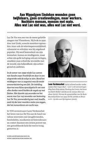 Luc De Vos was een van de meest geliefde zangers van Vlaanderen. Hij brak in 1992door met Gorki, scoorde meerdere toptien-hits, maar ook als televisiepersoonlijkheid, columnist en schrijver was hij ongekend populair. Hij werd bewonderd om zijn levenslust, humor en intelligentie, maar achter zijn gulle lach ging ook een verlegen, onzekere man schuil die worstelde met de wereld, zijn bekendheid, zijn achtergrond en ambities.
