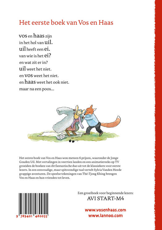 Het eerste boek van Vos en Haas won meteen 6 prijzen, waaronder de Jonge Gouden Uil. Met vertalingen in veertien landen en een animatiereeks op TV groeiden de boeken van dit fantastische duo uit tot de klassiekers voor eerste lezers.