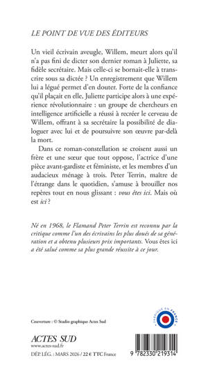 Un vieil écrivain aveugle, Willem, meurt alors qu'il n'a pas fini de dicter son dernier roman à Juliette, sa fidèle secrétaire. Mais celle-ci se bornait-elle à transcrire sous sa dictée ? Un enregistrement que Willem lui a légué permet d'en douter. Forte de la confiance qu'il plaçait en elle, Juliette participe alors à une expérience révolutionnaire : un groupe de chercheurs en intelligence artificielle a réussi à recréer le cerveau de Willem, offrant à sa secrétaire la possibilité de dialoguer avec lui et de poursuivre son oeuvre par-delà la mort. Dans ce roman-constellation se croisent aussi un frère et une soeur que tout oppose, l'actrice d'une pièce avant-gardiste et féministe, et les membres d'un audacieux ménage à trois. Peter Terrin, maître de l'étrange dans le quotidien, s'amuse à brouiller nos repères tout en nous glissant : "vous êtes ici". Mais où est "ici" ?