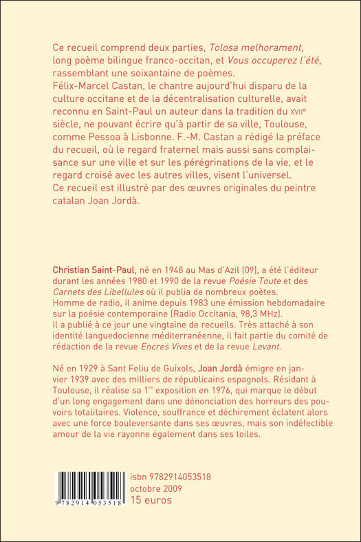 Le recueil présenté ici comprend deux parties, "Tolosa melhorament", long poème bilingue franco-occitan, et "Vous occuperez l’été", qui donne son titre au recueil, rassemblant une soixantaine de poèmes. Félix-Marcel Castan, le chantre aujourd’hui disparu de la culture occitane et de la décentralisation culturelle, avait reconnu en Saint-Paul un auteur dans la tradition du XVIIe siècle, ne pouvant écrire qu’à partir de sa ville, Toulouse, comme Pessoa à Lisbonne. F.-M. Castan a rédigé la préface du recueil, où le regard fraternel mais aussi sans complaisance sur une ville et sur les pérégrinations de la vie, et le regard croisé avec les autres villes, visent l’universel.
