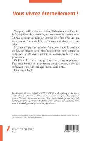 Voyageurs de l'Éternité, nous étions déjà les Grecs et les Romains de l'Antiquité et, de la même façon, nous serons les hommes et les femmes du futur, car nous ne sommes pas l'Être Apparent que nous croyons être, mais l'Être Réel, unique et éternel, qui seul existe. Mais nous l'ignorons, et nous n'en aurons jamais la certitude absolue, car chacune de nos vies s'achevant par l'oubli complet de ce que nous avons vécu, nous sommes convaincus de n'en avoir qu'une seule. Or l'Être Humain est engagé, à son insu, dans un processus d'existence éternelle qui ne comporte pas de sortie, et c'est sur ce vaisseau spatio-temporel que l'auteur vous invite. Bienvenue à bord !