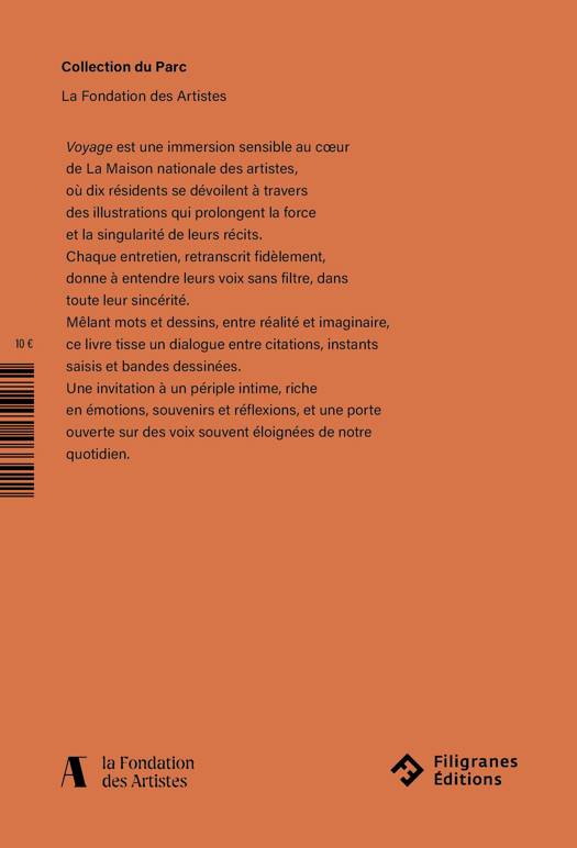 "Voyage est un projet illustré autour de dix personnalités résidentes à La Maison nationale des artistes. Les illustrations se veulent intemporelles et hors du champ lexical de l'âge et de la fin de vie. Chaque entretien est illustré par une citation, le lieu et l'heure de l'entretien, une pleine page de dessin et une page de bande dessinée. C’est un dialogue entre réalisme et imaginaire, entre présent et souvenir, accompagné de quelques phrases des entretiens avec les résidents, entrant en résonance avec ces images.â¨Chaque mot et chaque phrase ont été conservés intacts, simplement coupés sans ajout. Il était essentiel de respecter leurs façons de parler et leurs phrasés.â¨L’alliance du dessin et du texte peut parfois nous guider ou au contraire volontairement nous perdre et nous questionner.â¨Le titre Voyage évoque à la fois les entretiens avec les résidents, la résidence elle-même, la question de l'âge également, et même mon cheminement dans ce projet.â¨Au retour d'un voyage dans un pays inconnu c'est souvent un mélange d'émotions que l'on ressent, on en rapporte des photos, des images très nettes, et des sensations mais aussi des questionnements, des incompréhensions.  Il en ressort un sentiment d'intimité partagé avec des personnes si loin de nous ou de notre quotidien. C'est toutes ces impressions que j'ai ressenties, et que j'espère partager avec le lecteur." Â