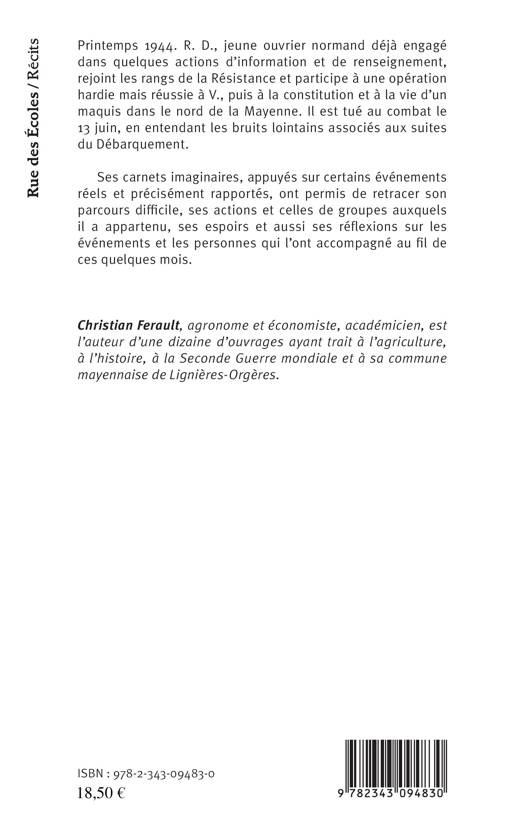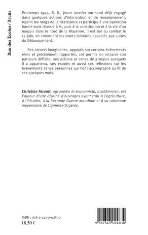 Printemps 1944, R. D., jeune ouvrier normand déjà engagé dans quelques actions d'information et de renseignement, rejoint les rangs de la Résistance et participe à la constitution et à la vie d'un maquis dans le nord de la Mayenne. Ses carnets imaginaires, appuyés sur des évènements réels et précisément rapportés, ont permis de retracer son parcours, ses espoirs et ses réflexions sur ces quelques mois de Résistance.
