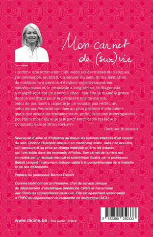 Soucieuse d'aider et d'informer au mieux les femmes atteintes d'un cancer du sein, Corinne Hubinont (docteur en médecine) relate, sans rien occulter, son parcours et sa prise en charge médicale et livre les astuces qui l'ont aidée dans les moments difficiles. Son carnet de (sur)vie est complété par un lexique médical et scientifique illustré par le professeur Benoît Lengelé ; instrument indispensable à la compréhension de la maladie et de ses traitements.