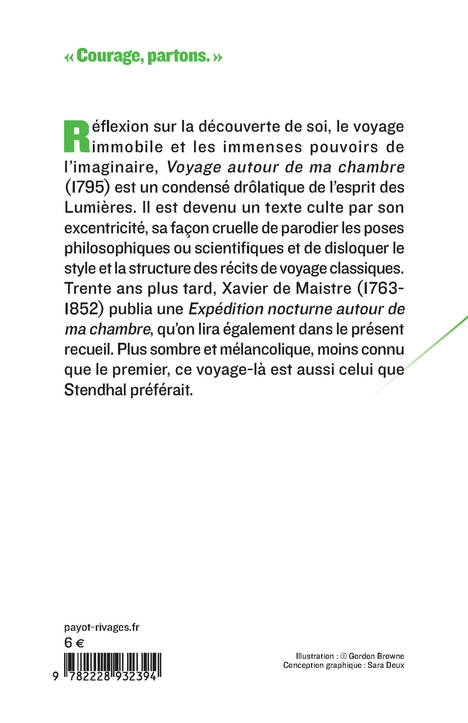 Réflexion sur la découverte de soi, le voyage immobile et les immenses pouvoirs de l'imaginaire, "Voyage autour de ma chambre" (1795) est un condensé drôlatique de l'esprit des Lumières. Il est devenu un texte culte par son excentricité, sa façon cruelle de parodier les poses philosophiques ou scientifiques et de disloquer le style et la structure des récits de voyage classiques. Trente ans plus tard, Xavier de Maistre (1763-1852) publia une "Expédition nocturne autour de ma chambre", qu'on lira également dans le présent recueil. Plus sombre et mélancolique, moins connu que le premier, ce voyage-là est aussi celui que Stendhal préférait.