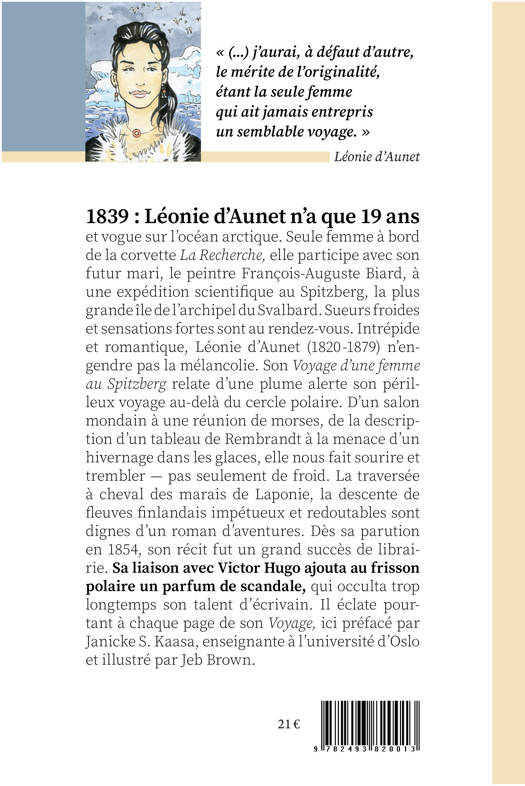 1839: Léonie d'Aunet n'a que 19 ans et vogue sur l'océan arctique. Seule femme à bord de la corvette La Recherche, elle participe avec son futur mari, le peintre François-Auguste Biard, à une expédition scientifique au Spitzberg, la plus grande île de l'archipel du Svalbard. Sueurs froides et sensations fortes sont au rendez-vous. Intrépide et romantique, Léonie d'Aunet (1820 -1879) n'engendre pas la mélancolie. Son Voyage d'une femme au Spitzberg relate d'une plume alerte son périlleux voyage au-delà du cercle polaire. D'un salon mondain à une réunion de morses, de la description d'un tableau de Rembrandt à la menace d'un hivernage dans les glaces, elle nous fait sourire et trembler - pas seulement de froid. La traversée à cheval des marais de Laponie, la descente de fleuves finlandais impétueux et redoutables sont dignes d'un roman d'aventures. Dès sa parution en 1854, son récit fut un grand succès de librairie. Sa liaison avec Victor Hugo ajouta au frisson polaire un parfum de scandale, qui occulta trop longtemps son talent d'écrivain. Il éclate pourtant à chaque page de son Voyage, ici préfacé par Janicke Stensvaag Kaasa, enseignante à l'université d'Oslo et illustré par Jeb Brown. Ce récit est assorti d'un cahier iconographique comprenant notamment des oeuvres de son mari François-Auguste Biard. PRESENTATION DE L’AUTEUR Léonie d'Aunet (1820-1879) fut la première femme à se rendre au Spitzberg, principale île de l'archipel du Svalbard.