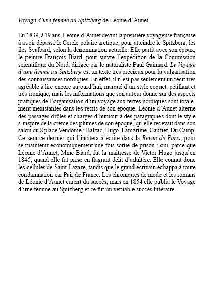 En 1839, à 19 ans, Léonie d'Aunet devint la première voyageuse française à avoir dépassé le Cercle polaire arctique, pour atteindre le Spitzberg, les îles Svalbard. Elle partit avec son époux, le peintre François Biard, pour suivre l'expédition de la Commission scientifique du Nord, dirigée par le naturaliste Paul Gaimard. Le Voyage d'une femme au Spitzberg est un texte très précieux pour la vulgarisation des connaissances nordiques. Ce n'est pas seulement un récit très agréable à lire encore aujourd'hui, marqué d'un style coquet, pétillant et très ironique, mais les informations que son auteur donne sur des aspects pratiques de l'organisation d'un voyage aux terres nordiques sont totalement Inexistantes dans les récits de son époque. Léonie d'Aunet alterne des passages drôles et chargés d'humour à des paragraphes dont le style s'inspire des plus belles plumes de son époque, qu'elle recevait dans son salon place Vendôme : Balzac, Hugo, Lamartine, Gautier, Du Camp. C'est ce dernier qui l'incitera à écrire dans la Revue de Paris, pour se maintenir économiquement une fois sortie de prison. Car Léonie d'Aunet, Mme Biard, fut la maîtresse de Victor Hugo Jusqu'en 1845, alors prise en flagrant délit d'adultère. Elle connut les cellules de Saint-Lazare, tandis que le grand écrivain, Pair de France, échappa à toute condamnation. Les chroniques de mode et les romans de Léonie d'Aunet eurent du succès, mais en 1854 elle publia le Voyage d'une femme au Spitzberg et ce fut un véritable succès littéraire.
