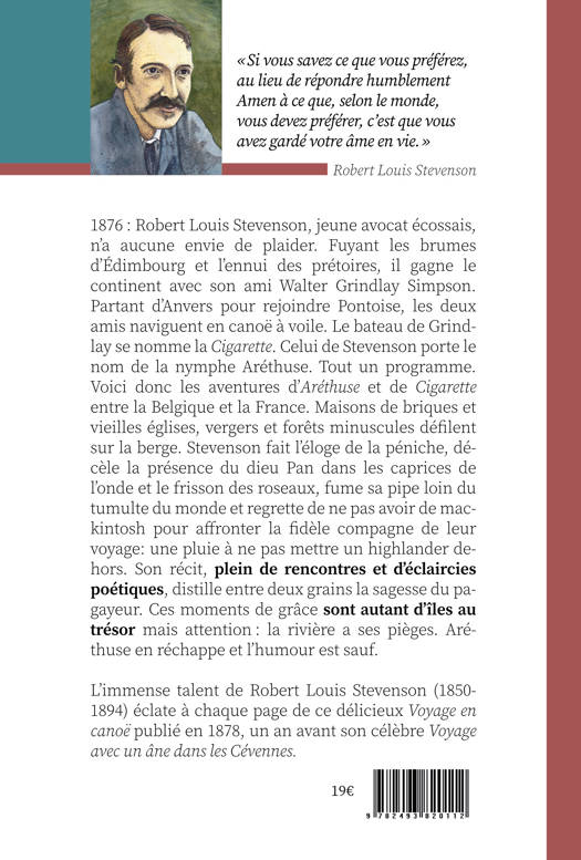 1876: Robert Louis Stevenson, jeune avocat écossais, n'a aucune envie de plaider. Fuyant les brumes d'Édimbourg et l'ennui des prétoires, il gagne le continent avec son ami Walter Grindlay Simpson. Partant d'Anvers pour rejoindre Pontoise, les deux amis naviguent en canoë à voile. Le bateau de Grindlay se nomme la Cigarette. Celui de Stevenson porte le nom de la nymphe Aréthuse. Tout un programme. Voici donc les aventures d'Aréthuse et de Cigarette entre la Belgique et la France. Maisons de briques et vieilles églises, vergers et forêts minuscules défilent sur la berge. Stevenson fait l'éloge de la péniche, décèle la présence du dieu Pan dans les caprices de l'onde et le frisson des roseaux, fume sa pipe loin du tumulte du monde et regrette de ne pas avoir de mackintosh pour affronter la fidèle compagne de leur voyage: une pluie à ne pas mettre un highlander dehors. Son récit, plein de rencontres et d'éclaircies poétiques, distille entre deux grains la sagesse du pagayeur. Ces moments de grâce sont autant d'îles au trésor mais attention: la rivière a ses pièges. Aréthuse en réchappe et l'humour est sauf. L'immense talent de Robert Louis Stevenson (1850-1894) éclate à chaque page de ce délicieux Voyage en canoë publié en 1878, un an avant son célèbre Voyage avec un âne dans les Cévennes.