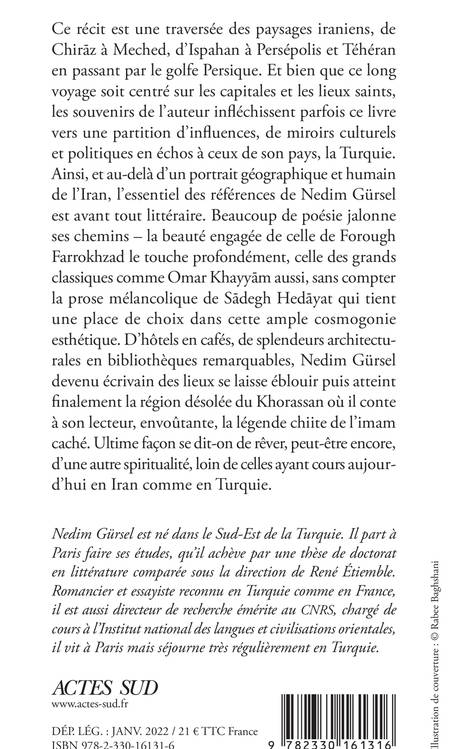 Ce récit est une traversée des paysages iraniens, de Chirāz à Meched, d'Ispahan à Persépolis et Téhéran en passant par le golfe Persique. Et bien que ce long voyage soit centré sur les capitales et les lieux saints, les souvenirs de l'auteur infléchissent parfois ce livre vers une partition d'influences, de miroirs culturels et politiques en échos à ceux de son pays, la Turquie. Ainsi, et au-delà d'un portrait géographique et humain de l'Iran, l'essentiel des références de Nedim Gürsel est avant tout littéraire. Beaucoup de poésie jalonne ses chemins - la beauté engagée de celle de Forough Farrokhzad le touche profondément, celle des grands classiques comme Omar Khayyām aussi, sans compter la prose mélancolique de Sādegh Hedāyat qui tient une place de choix dans cette ample cosmogonie esthétique. D'hôtels en cafés, de splendeurs architecturales en bibliothèques remarquables, Nedim Gürsel devenu écrivain des lieux se laisse éblouir puis atteint finalement la région désolée du Khorassan où il conte à son lecteur, envoûtante, la légende chiite de l'imam caché. Ultime façon se dit-on de rêver, peut-être encore, d'une autre spiritualité, loin de celles ayant cours aujourd'hui en Iran comme en Turquie.