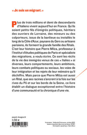 Plus de trois millions et demi de descendants d'Italiens vivent aujourd'hui en France. Qu'ils soient petits-fils d'émigrés politiques, héritiers des ouvriers de Lorraine, des mineurs ou des colporteurs, issus de la banlieue ou installés le long de la Côte d'Azur, paysans du Gers ou artisans parisiens, ils forment la grande famille des Ritals. C'est leur histoire que Pierre Milza, professeur à l'Institut d'études politiques de Paris et spécialiste des migrations, a voulu écrire. Ce sont les récits de la vie des immigrés venus de ces Italies si diverses, leurs comportements, leurs ambitions, leurs combats politiques ou sociaux, les voies de leur intégration et les rejets de leur mémoire qu'il déchiffre. Mais parce que Pierre Milza est aussi un Rital, que ses racines s'ancrent à la fois sur les rives du Pô et sur les bords de la Seine, ce livre établit un dialogue exceptionnel entre l'histoire d'une communauté et la chronique d'une vie.