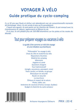 Qu'il s'agisse d'un périple de quelques jours, de quelques semaines pour les vacances, ou s'étalant sur une année sabbatique voire sur plusieurs années ; que l'on aille sur les routes et les chemins de France ou sur les routes et les pistes du monde chacun trouvera dans ce guide l'ensemble des informations indispensables à la préparation de son projet puisque ce qui est utile pour un voyage au long cours convient à des vacances à vélo. Les auteurs ont des partis pris : utiliser un matériel peu encombrant et d'une extrême simplicité ayant fait ses preuves sur des itinéraires aussi longs et accidentés que possible, être solidaire et discret et, enfin, voyager lentement sur une bicyclette qui n'est qu'un mode de locomotion, peu importe le kilométrage journalier ! Paule et Arthur ont voulu que ce guide soit accessible à tous, que son contenu ne soit pas trop technique, ce qui pourrait effrayer les candidats au départ. Pour l'agrémenter ils l'ont émaillé d'anecdotes fleurant bon l'aventure à dimension humaine. « Vélomanes », dans ces pages ils ont écrit des leçons de vrai bonheur…