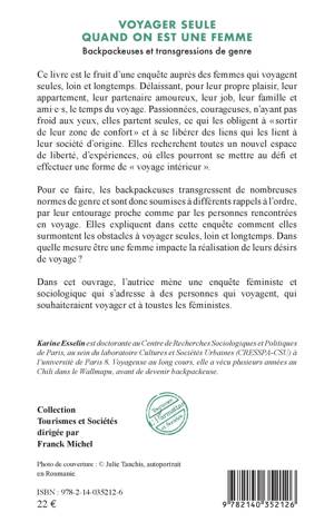 Ce livre est le fruit d'une enquête auprès des femmes qui voyagent seules, loin et longtemps. Passionnées, courageuses, n'ayant pas froid aux yeux, elles partent seules, ce qui les obligent à sortir de leur zone de confort et à se libérer des liens qui les lient à leur société d'origine. Elles recherchent toutes un nouvel espace de liberté, d'expériences, où elles pourront se mettre au défi et effectuer une forme de voyage intérieur . Pour ce faire, les backpackeuses transgressent de nombreuses normes de genre et sont donc soumises à différents rappels à l'ordre, par leur entourage proche comme par les personnes rencontrées en voyage. Elles expliquent dans cette enquête comment elles surmontent les obstacles à voyager seules, loin et longtemps. Dans quelle mesure être une femme impacte la réalisation de leurs désirs de voyage ? Dans cet ouvrage, l'autrice mène une enquête féministe et sociologique qui s'adresse à des personnes qui voyagent, qui souhaiteraient voyager et à toustes les féministes.