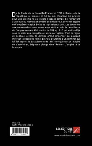 De la Chute de la Nouvelle-France en 1759 à Rome - de la république à l’empire en 51 av. J.C, Stéphane est projeté pour une sixième fois à travers l’espace-temps. Se retrouvant à un nouveau moment charnière de l’Histoire, il devient l’adjoint de l’enquêteur Appius Botila de la praefectus urbi. Les deux sont aux trousses d’un tueur en série qui sévit au sein de la noblesse de l’empire romain. Cet empire de 209 ap. J.-C qui vacille déjà sous le poids des conquêtes et de la corruption. C’est le règne de Septime Sévère, le dernier grand empereur qui pourrait inverser le déclin de Rome. Entre la poursuite d’un criminel qui lui échappe et le basculement de l’Histoire qui est sur le point de s’accélérer, Stéphane plonge dans Rome - L’empire à la brunante.