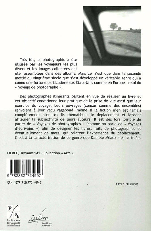 Des photographes itinérants partent en vue de réaliser un livre et cet objectif conditionne leur pratique de la prise de vue ainsi que leur exercice du voyage. Leurs ouvrages (conçus comme des ensembles) renvoient à leur vécu vagabond, même si la fiction n'en est jamais complètement absente ; ils thématisent le déplacement et laissent affleurer la subjectivité de leurs auteurs. Il est dès lors loisible de parler de « Voyages de photographes » (comme on parle de « Voyages d'écrivains ») afin de désigner les livres, faits de photographies et éventuellement de mots, qui relatent l'expérience du déplacement. C'est à la caractérisation de ce genre que Danièle Méaux s'est attelée.