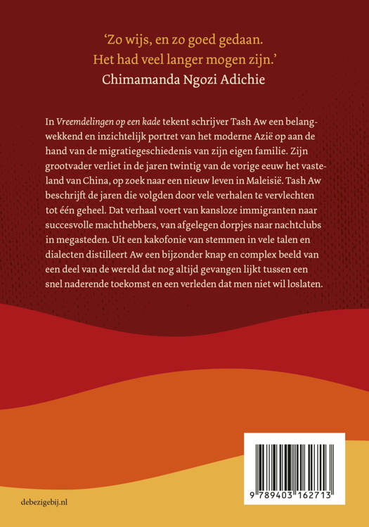 In Vreemdelingen op een kade tekent schrijver Tash Aw een belangwekkend en inzichtelijk portret van het moderne Azië op aan de hand van de migratiegeschiedenis van zijn eigen familie. Zijn grootvader verliet in de jaren twintig van de vorige eeuw het vasteland van China, op zoek naar een nieuw leven in Maleisië. Tash Aw beschrijft de jaren die volgden door vele verhalen te vervlechten tot één geheel. Dat verhaal voert van kansloze immigranten naar succesvolle machthebbers, van afgelegen dorpjes naar nachtclubs in megasteden. Uit een kakofonie van stemmen in vele talen en dialecten distilleert Aw een bijzonder knap en complex beeld van een deel van de wereld dat nog altijd gevangen lijkt tussen een snel naderende toekomst en een verleden dat men niet wil loslaten.