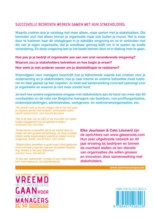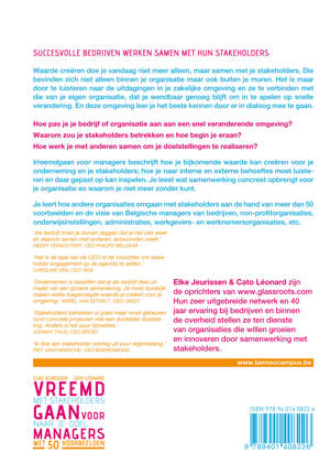 Succesvolle bedrijven werken samen met hun stakeholders Beter leren omgaan met je mede- en tegenstanders & omgaan met de kwetterende massa rondom je organisatie. Waarde creëren doe je vandaag niet meer alleen, maar samen met je stakeholders. Die stakeholders bevinden zich niet alleen binnen je organisatie maar ook buiten je muren. Het is maar door te luisteren naar de uitdagingen in je zakelijke omgeving dat je wendbaar genoeg blijft om in te spelen op snelle verandering. En deze omgeving, leer je het beste kennen door er in dialoog mee te gaan. Vreemd gaan voor managers beschrijft hoe je bijkomende waarde kan creëren voor jezelf en je stakeholders; hoe je naar interne en externe behoeftes moet luisteren en daar gepast op kan inspelen.