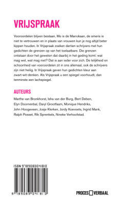 Vooroordelen blijven bestaan, Mo is de Marrokaan, de smeris is niet te vertrouwen en in plaats van vrouwen kun je nog altijd beter kippen houden. In Vrijspraak zoeken dertien schrijvers met hun gedichten de grenzen op van het toelaatbare. Die grenzen ontstaan door het geweten dat daarbij in het geding komt: wat mag wel, wat mag niet? Dat is aan ieder voor zich. De lelijkheid en schoonheid van vooroordelen zit in ons allemaal, ook de schrijvers zijn niet heilig. In Vrijspraak geven hun gedichten kleur aan zwart-wit-denken. Als Vrijspraak u een spiegel voorhoudt, dan tenminste een lachspiegel.