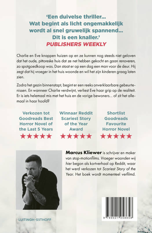Vroeger woonden wij hier is het prijswinnende en huiveringwekkende debuut van Marcus Kliewer. Het boek is verkozen tot Reddit NoSleep Scariest Story of the Year en Goodreads Best Horror Novel of the Last 5 Years. Een verfilming op Netflix is in de maak. Charlie en Eve kunnen niet geloven dat het oude, pittoreske huis in de bergen dat ze net hebben gekocht zo spotgoedkoop was. Dan staat er op een dag een man voor de deur. Hij zegt dat hij vroeger in het huis woonde en wil het zijn gezin graag laten zien. Zodra het gezin binnenstapt, begint een reeks onverklaarbare gebeurtenissen. Wanneer Charlie verdwijnt, verliest Eve haar grip op de realiteit. Is er echt iets mis met het huis of zit het allemaal in haar hoofd? 'Een sfeervolle nachtmerrie in alle opzichten.' Booklist 'Origineel en extreem eng… een angstaanjagend debuut.' Kirkus Reviews