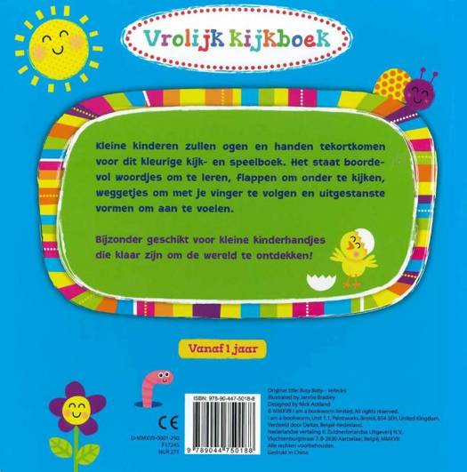 Kleine kinderen zullen ogen en handen tekortkomen voor dit kleurige kijk- en speelboek. Het staat boordevol woordjes om te leren, flappen om onder te kijken, weggetjes om met je vinger te volgen en uitgestanste vormen om aan te voelen.
