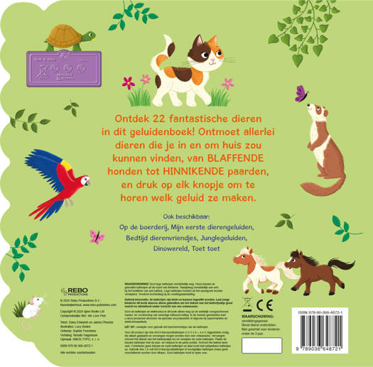 Ontdek 22 fantastische dieren in dit geluidenboek! Ontmoet allerlei dieren die je in en om huis zou kunnen vinden, van BLAFFENDE honden tot HINNIKENDE paarden, en druk op elk knopje om te horen welk geluid ze maken.