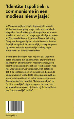 In Vrouw en vrijheid maakt topbiografe Jolande Withuis een rondgang langs onderwerpen als de biografie, borstkanker, geheim agenten, vrouwenvoetbal en werklust, en langs eigenzinnige vrouwen als Simone de Beauvoir, Jeanne Bieruma Oosting, Carry van Bruggen, Ana Pauker en Sylvia Plath. Tegelijk analytisch én persoonlijk, scherp én geestig neemt Withuis nadrukkelijk stelling tegen het identiteits- en diversiteitsdenken. Pas als vrouwen zichzelf ontslaan van het streven ‘vrouwelijk’ te zijn, komt hun vrijheid nabij.