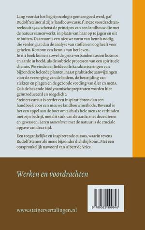 Lang voordat het begrip ecologie gemeengoed werd, gaf Rudolf Steiner al zijn 'landbouwcursus'. Deze voordrachten¬ reeks uit 1924 schetst de principes van een landbouw die met de natuur samenwerkt, in plaats van haar op te jagen en uit te buiten. Daarvoor is een nieuwe vorm van kennis nodig, die verder gaat dan de analyse van stoffen en oog heeft voor gehelen. Kortom: een kennis van het leven. In dit boek komen zowel de grote verbanden tussen kosmos en aarde in beeld, als de subtiele processen van een spirituele chemie. We vinden er liefdevolle karakteriseringen van bijzondere helende planten, naast praktische aanwijzingen voor de verzorging van de bodem, de bestrijding van ziekten en plagen en de gezonde voeding van dier en mens. Ook de bekende biodynamische preparaten worden hier geïntroduceerd en toegelicht. Steiners cursus is eerder een inspiratiebron dan een handboek voor een nieuwe landbouwmethode. Bovenal is het een appel aan de boer om zich als hele mens te verbinden met zijn bedrijf, met dit stuk van de aarde, met deze dieren en gewassen. Leren samenleven met de natuur is de cruciale opgave van deze tijd.