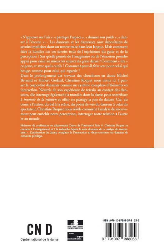 Les danseurs sont dépositaires de différents savoirs implicites dont on trouve la trace dans leur langue spécifique : que veulent-ils dire lorsqu'ils parlent de « s'appuyer sur l'espace », de « donner son poids » ou de « danser à l'écoute » ? La danse est-elle une affaire de corps ? Pourquoi parler de geste plutôt que de mouvement ? Qu'en est-il de l'état de corps, de l'émotion, du partage de l'espace, lorsque nous dansons ou nous regardons danser ? Si l'auteure inscrit sa démarche dans le prolongement des réflexions des théoriciens du mouvement Michel Bernard et Hubert Godard, elle se nourrit également de son expérience de terrain au contact des danseurs pour donner corps à son propos. Elle convoque enfin des exemples très divers qui montrent combien l'analyse du mouvement peut enrichir notre perception du monde.