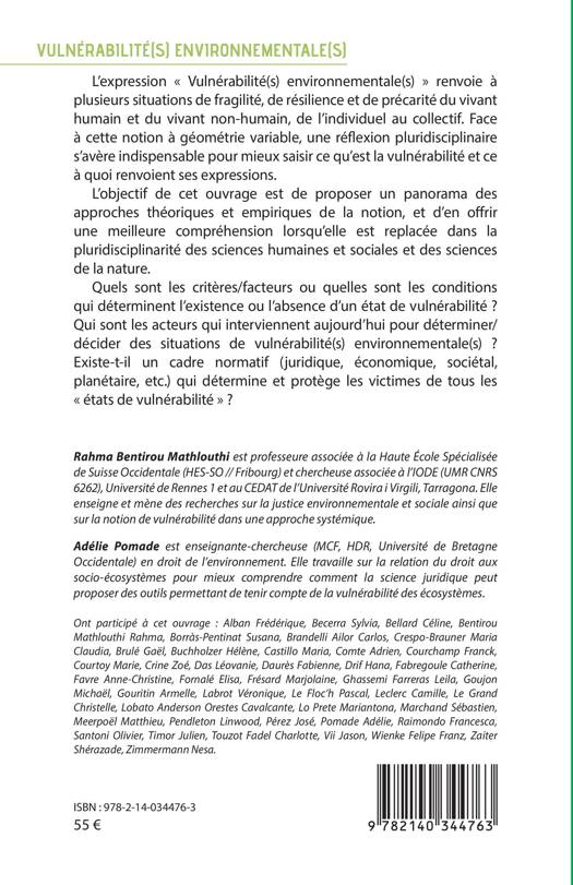 L'expression « Vulnérabilité(s) environnementale(s) » renvoie à plusieurs situations de fragilité, de résilience et de précarité du vivant humain et du vivant non-humain, de l'individuel au collectif. Face à cette notion à géométrie variable, une réflexion pluridisciplinaire s'avère indispensable pour mieux saisir ce qu'est la vulnérabilité et ce à quoi renvoient ses expressions. L'objectif de cet ouvrage est de proposer un panorama des approches théoriques et empiriques de la notion, et d'en offrir une meilleure compréhension lorsqu'elle est replacée dans la pluridisciplinarité des sciences humaines et sociales et des sciences de la nature. Quels sont les critères/facteurs ou quelles sont les conditions qui déterminent l'existence ou l'absence d'un état de vulnérabilité ? Qui sont les acteurs qui interviennent aujourd'hui pour déterminer/décider des situations de vulnérabilité(s) environnementale(s) ? Existe-t-il un cadre normatif (juridique, économique, sociétal, planétaire, etc.) qui détermine et protège les victimes de tous les « états de vulnérabilité » ?