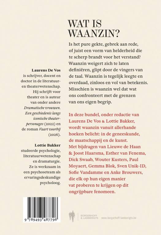 In deze bundel, onder redactie van Laurens De Vos & Lottie Bakker, wordt waanzin vanuit allerhande hoeken belicht: in de geneeskunde, de maatschappij en de kunst. Onder anderen Dick Swaab, Lieuwe de Haan, Wouter Kusters, Esther van Fenema en Paul Moyaert droegen bij aan dit boek en proberen elk op hun manier vat te krijgen op dit ongrijpbare fenomeen.