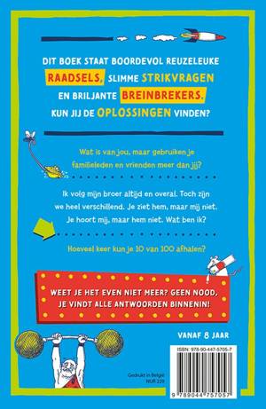 Dit boek staat boordevol reuzeleuke raadsels, slimme strikvragen en briljante breinbrekers. Kun jij de oplossingen vinden? * Wat is van jou, maar gebruiken je familieleden en vrienden meer dan jij? * Ik volg mijn broer altijd en overal. Toch zijn we heel verschillend. Je ziet hem, maar mij niet. Je hoort mij, maar hem niet. Wat ben ik? * Hoeveel keer kun je 10 van 100 afhalen? Weet je het even niet meer? Geen nood, je vindt alle antwoorden binnenin! Vanaf 8 jaar