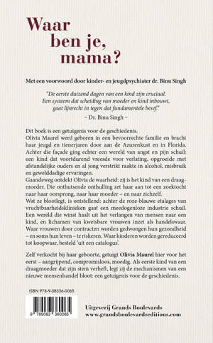 In dit indringende getuigenis onthult Olivia Maurel de duistere realiteit achter de glitter van de draagmoederindustrie: contracten die scheiding bij geboorte programmeren, vrouwenlichamen die worden geïnstrumentaliseerd en kinderen die gereduceerd worden tot koopwaar. Zelf geboren uit draagmoederschap, zoekt Maurel naar de vrouw die haar droeg en naar de waarheid achter haar ontstaan. Die persoonlijke queeste ontrafelt een systeem dat de primaire band tussen moeder en kind doorbreekt en een kwetsbare beginfase tot markt maakt. Waar ben je, mama? verbindt verhaal, feiten, getuigenissen en juridische documenten, en verschuift het debat: niet het recht op een kind, maar de rechten van het kind. Met een voorwoord van kinder- en jeugdpsychiater dr. Binu Singh. Een noodzakelijke stem voor wie wil weten wat we wel — en niet — mogen organiseren aan het begin van een mensenleven.