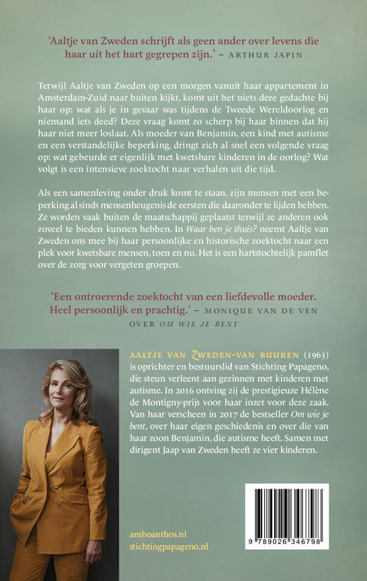 Waar ben je thuis? van Aaltje van Zweden is een urgent en ontroerend boek dat niemand mag missen. Terwijl Aaltje van Zweden op een morgen in Amsterdam naar buiten kijkt, komt er ineens een gedachte bij haar op: wat als je in gevaar bent en niemand wat doet? Ze heeft zich dat nog nooit eerder afgevraagd. Aaltje begrijpt niet helemaal waarom dit zo scherp binnenkomt en besluit op onderzoek te gaan. Het blijkt dat er vanuit de woning waar ze tijdelijk woont tijdens de Tweede Wereldoorlog een Joodse familie is gedeporteerd en vermoord.