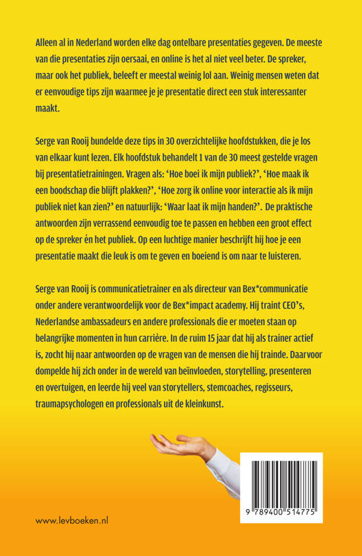 Serge van Rooij geeft antwoord op de 25 meest gestelde vragen bij presentatie-trainingen. Vragen als: ‘Hoe maak ik een boodschap die blijft plakken?’, ‘Ben ik nog wel authentiek als ik oefen?’, ‘Hoe kan ik zorgen voor meer interactie met mijn publiek?’ en natuurlijk ‘Waar laat ik mijn handen?’. De praktische antwoorden zijn verrassend eenvoudig toe te passen en hebben een groot effect op de spreker én het publiek. Op een luchtige manier beschrijft hij hoe je een presentatie maakt die leuk is om te geven en boeiend is om naar te luisteren.