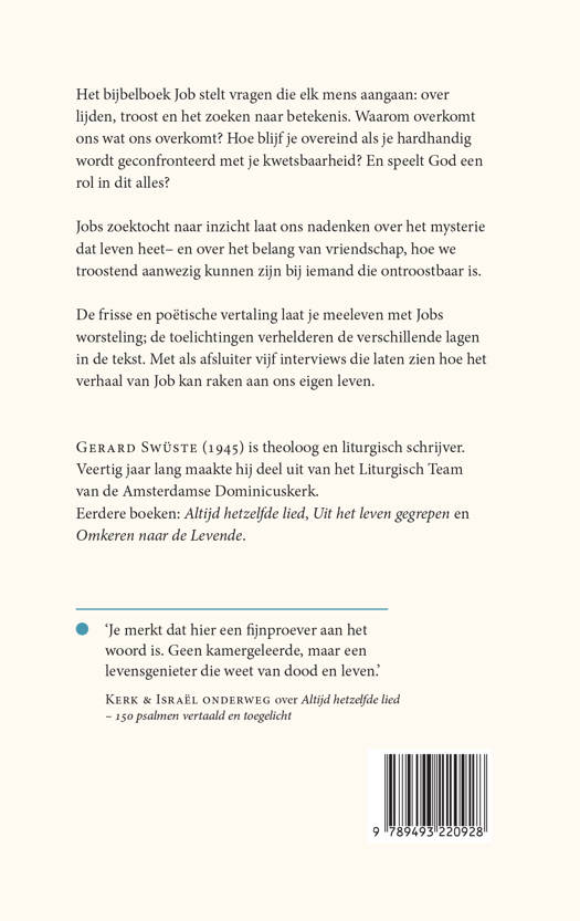 De frisse en poëtische vertaling laat je meeleven met Jobs worsteling; de korte, treffende toelichtingen bij elk tekstgedeelte verhelderen de diepte en lagen in de tekst. Met als afsluiter vijf interviews die laten zien hoe het verhaal van Job kan raken aan ons eigen leven. Interviews met Houkje van der Weij en Jos Verhagen, Arjan Broers, Geeske Hovingh, André Wesche, en Colet van der Ven.