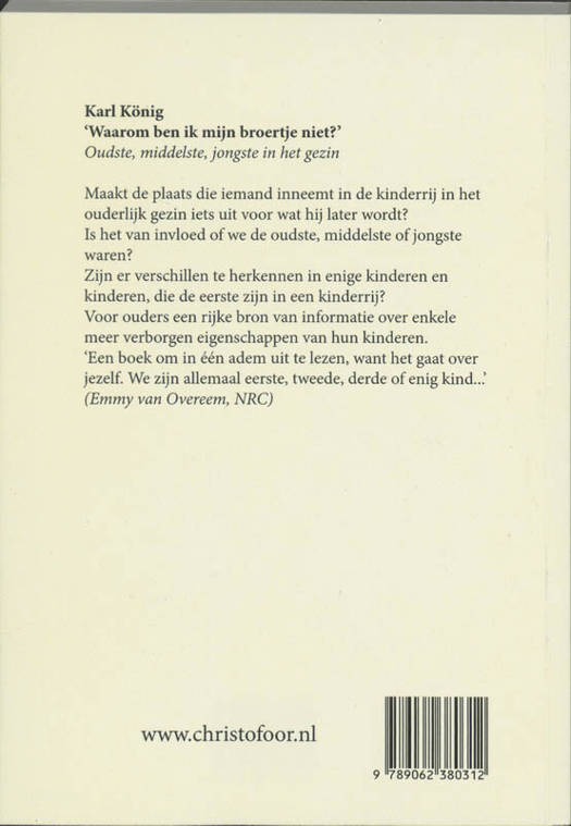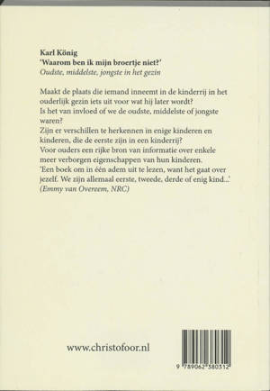 Dit boek behandelt de vraag, of de plaats die een kind in de rangorde van leeftijden tussen de broers en zusjes in het gezin inneemt, mede bepalend is voor zijn latere weg.