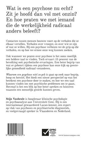 Wat is een psychose nu echt? Zit je hoofd dan vol met onzin? En hoe praten we met iemand die de werkelijkheid radicaal anders beleeft? Contacten tussen mensen bouwen voort op de verhalen die ze elkaar vertellen. Verhalen over vroeger, en over wie ze zijn of wat ze willen. Bij een psychose verliezen we de grip op die verhalen, en op hoe we ermee onze weg kunnen zoeken. Ook wanneer we praten over psychose is het soms moeilijk een heldere taal te vinden. Toch ervaart 15 procent van de bevolking ooit psychotische ervaringen. Een beter begrip van wat er gebeurt tijdens een psychose kan onze kijk op geestelijke gezondheid radicaal veranderen. Waarom een psychose niet zo gek is gaat op zoek naar begrip, hoop en herstel. Het biedt een nieuw perspectief op wat het betekent een psychose door te maken, en hoe we een taal kunnen vinden om met psychische problemen om te gaan. Bovenal is het een blik op hoe beter spreken en luisteren waanzin een menselijk gezicht kunnen geven.