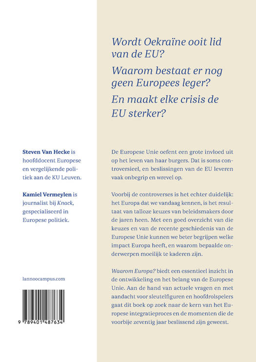Wordt Oekraïne ooit lid van de EU? Waarom bestaat er nog geen Europees leger? En maakt elke crisis de EU sterker? De Europese Unie oefent een grote invloed uit op het leven van haar burgers. Dat is soms controversieel, en beslissingen van de EU leveren vaak onbegrip en wrevel op. Voorbij de controverses is het echter duidelijk: het Europa dat we vandaag kennen, is het resultaat van talloze keuzes van beleidsmakers door de jaren heen. Met een goed overzicht van die keuzes en van de recente geschiedenis van de Europese Unie kunnen we beter begrijpen welke impact Europa heeft, en waarom bepaalde onderwerpen moeilijk te kaderen zijn. Waarom Europa? biedt een essentieel inzicht in de ontwikkeling en het belang van de Europese Unie. Aan de hand van actuele vragen en met aandacht voor sleutelfiguren en hoofdrolspelers gaat dit boek op zoek naar de kern van het Europese integratieproces en de momenten die de voorbije zeventig jaar beslissend zijn geweest.