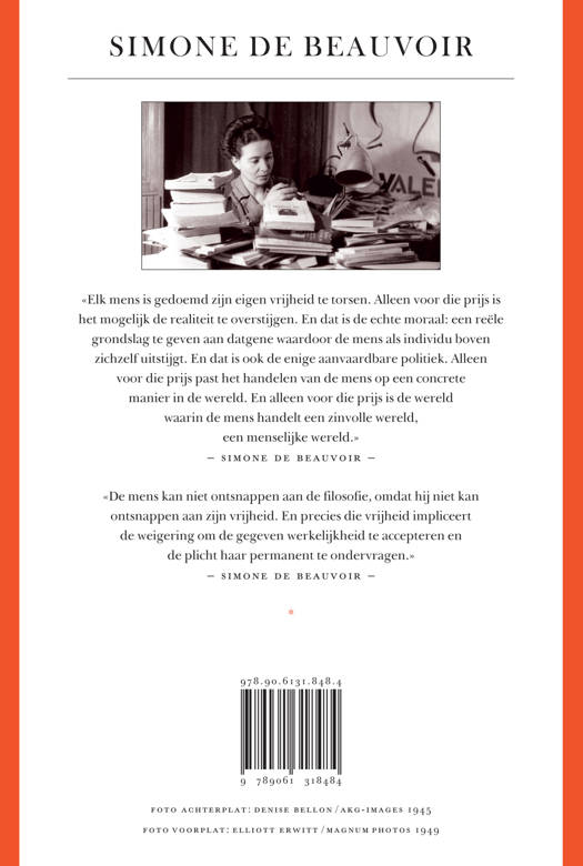Simone de Beauvoir (1908-1986) geldt als een der belangrijkste schrijvers en denkers van onze tijd. Zij publiceerde talrijke succesvolle en over de hele wereld vertaalde romans, alsook uitermate invloedrijke filosofische geschriften, zoals «Pour une morale de l’ambiguïté» (1947; in Nederland verschenen als «Pleidooi voor een moraal der dubbelzinnigheid») en haar beroemde en grensverleggende studie over de vrouw «Le deuxième sexe» (1949, in Nederland verschenen als «De tweede sekse»).